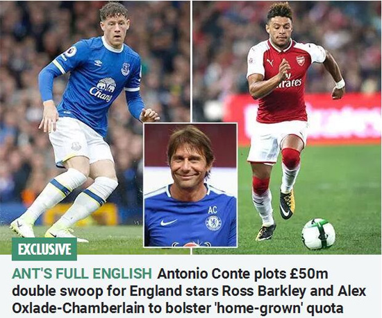 英国媒体《太阳报》消息称,埃弗顿中场巴克利和阿森纳飞翼张伯伦进入主帅孔蒂的视野,切尔西打算出资5000万英镑将其打包。今年夏天,切尔西本土青训球员走了贝戈维奇和特里,引进的球员有卡巴莱罗、吕迪格、巴卡约科和莫拉塔,四名新援均非本土青训球员;按照现在的规则,这样的补充不仅难以满足英足总的报名规则,还难以满足欧足联的报名规则。舰队街坦言,未来一个赛季切尔西要四线征战,如果大名单里没有足够的球员,一旦出现伤停情况下,主帅孔蒂就陷入大麻烦了。
