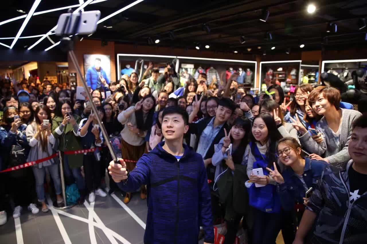 今天的商业活动原定于下午2点开始,还不到1点,粉丝们就将店铺水泄不通地围了起来,其中大部分都是正在上学的学生。看到这么多球迷到场,主办方负责人直呼没想到:“真没想到会来这么多人,这还是工作日!”下午1点30分,当马龙走进活动现场,现场马上响起迷妹们的尖叫声和拍照的快门声,让人感觉好似娱乐圈的追星现场。看到热情的球迷们,马龙又开心又不解:“你们都不上学吗?”