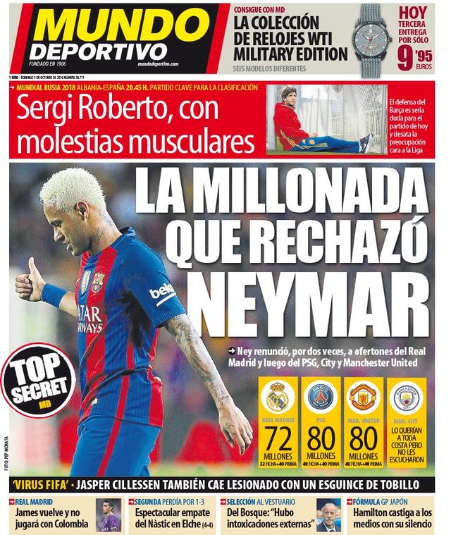 西班牙的《世界体育报》透露,为了留守诺坎普球场,内马尔也付出巨大,今年夏天,多支豪门希望邀请他,且开出了不菲的合同。不过内马尔拒绝了皇马的两次邀请,还拒绝了曼城、曼联和巴黎圣日耳曼。