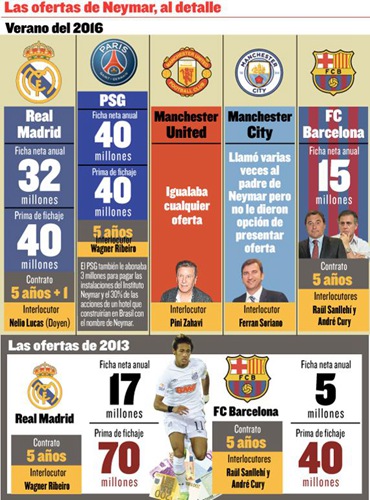 目前内马尔的年薪是800万欧元,违约金达到1.9亿欧元,可是今年夏天,他受到的诱惑超乎想象,有四支豪门试图引进内马尔。《世界体育报》透露,为了得到内马尔,皇马通过东银体育用品公司联络内少,他们开出了一份5+1合同,年薪是3200万欧元,签字费也有4000万欧元,可是内马尔没有接受。