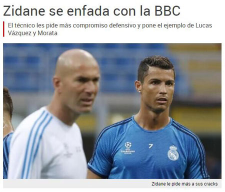 现代足球要求所有球员都必须参与防守,皇马曾经吃过大亏,上赛季主场对阵巴萨,贝尔、本泽马、J罗和C罗都不参与防守,最终银河战舰0-4惨败。虽然欧冠面对华沙军团5-1取胜,但是如果对方射术再精湛一些,皇马可能就不会这个比分收场了。《每日体育报》指出:齐达内对C罗、贝尔和本泽马的防守态度不满。