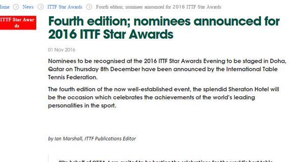 根据国际乒联官网的消息,共有八名运动员获得了年度最佳的提名,男女各四人。男子方面包括了里约男单冠军马龙、世界杯冠军樊振东、日本男单头牌、里约奥运男单第三名水谷隼和尼日利亚大黑马阿鲁纳;而女子方面,里约奥运会女单冠军丁宁和日本两小将伊藤美诚和平野美宇悉数入选,同时入选的还有朝鲜名将金宋依。