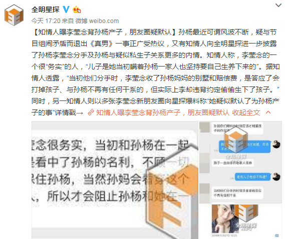 这位知情人还爆料,李莹念是一个很务实的女孩,当初与孙杨交往也是看中了孙杨的名利。孙杨的母亲发觉后让二人分手,并给予一定的赔偿,约定李莹念打掉孩子并不再联系。谁知李莹念违反了约定,偷偷生下孩子,而孙杨可能也是直到媒体曝光才知情。