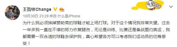 在被指责过后,王哲林更新了自己的社交媒体,他在微博中这样写道:“为什么我必须换掉赞助商的球鞋才能上场打球。对于这个情况我非常失望。过去一年多我一直在不停的努力恢复腿伤,无论是训练、比赛还是备战里约奥运,我都需要一双合适的球鞋去保护我,真心希望各方可以考虑我们运动员的切身感受!”通过微博,王哲林表达了自己的不满情绪,同时他也希望能够和相关机构协商,最终顺利解决此事。