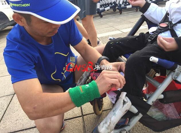 暖父推着脑瘫儿子跑杭马 望将来一起完赛铁三