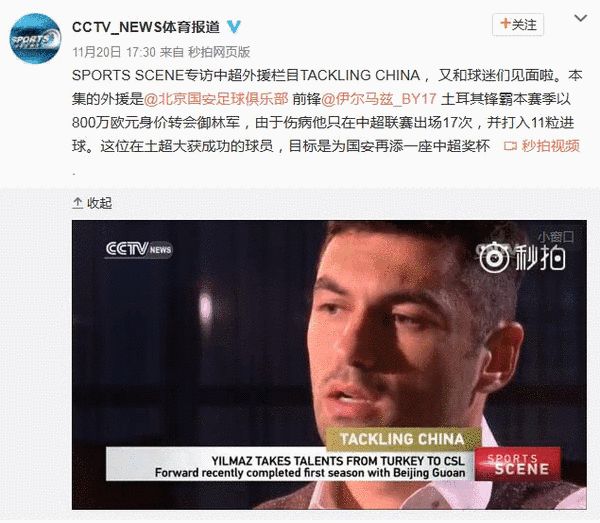 日前CCTV外语频道SPORTS SCENE专访中超外援栏目《TACKLING CHINA》中, 对北京国安来自 土耳其的锋霸伊尔马兹进行了专访,伊尔马兹对自己在北京国安的生活表示满意,并直言希望下赛季帮助球队获得冠军奖杯。
