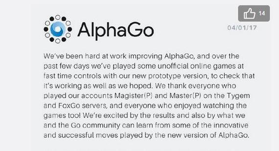 1月4日晚,Master以60胜0负1和的战绩结束了快棋挑战人类高手的测试,随后AlphaGo团队的樊麾通过微博发布了DeepMind的正式公告,确认了Master就是最新版本的AlphaGo。