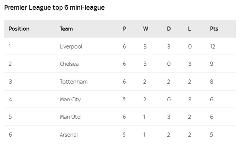 在前6的直接对决中 利物浦排榜首