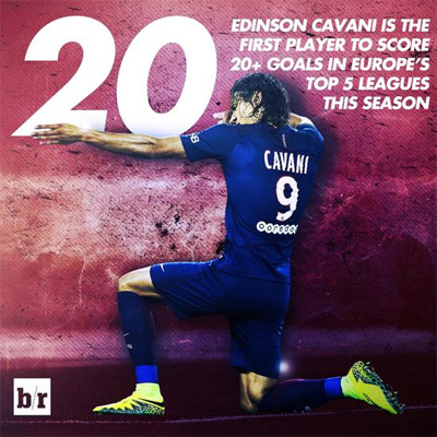 2016-17赛季欧洲五大联赛均已过半,法甲巨头巴黎圣日耳曼中锋卡瓦尼成为了第一个进球达到20个的射手,21场20球的乌拉圭人效率惊人。