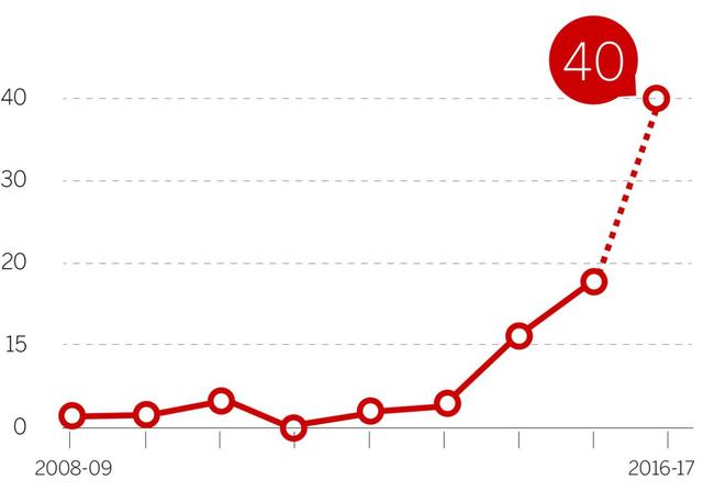 在本赛季前45场比赛当中,韦斯布鲁克拿了22个三双,也就是说在本赛季剩余的37场比赛当中,他还需要再拿19个三双,才能像罗伯特森那样在一个赛季中拿到41个三双。那么,韦斯布鲁克在本赛季能拿到多少个三双?下图为韦斯布鲁克职业生涯每个赛季的三双次数,Pelton预计他在本赛季能拿到40个三双(在1月17日为39个,之后曾下降到38个)。