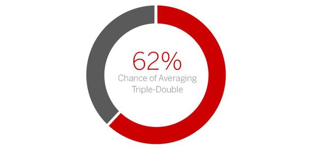 在1961-62赛季,罗伯特森成为NBA历史上唯一一位在整个赛季都保持场均三双表现的球员,那个赛季他拿了41个三双(职业生涯181个)。韦斯布鲁克有机会比肩罗伯特森,那么现在,他在整个赛季都保持场均三双表现的概率是多少?ESPN撰稿人Kevin Pelton通过计算,得出了韦斯布鲁克完成这一壮举的概率,目前的概率已经高达62%(在1月17日为60%,之后曾下降到57%)。