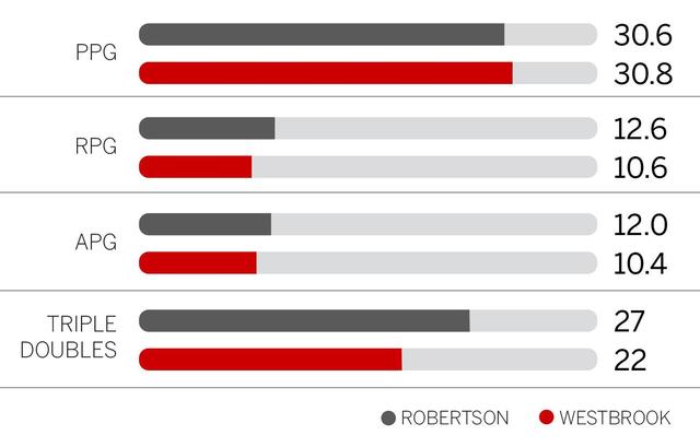 在本赛季的前45场比赛中,韦斯布鲁克拿到了22个三双,场均能拿到30.8分、10.6个篮板和10.4次助攻;而在1961-62赛季的前45场比赛中,罗伯特森拿了27个三双,场均能拿到30.6分、12.6个篮板和12次助攻。