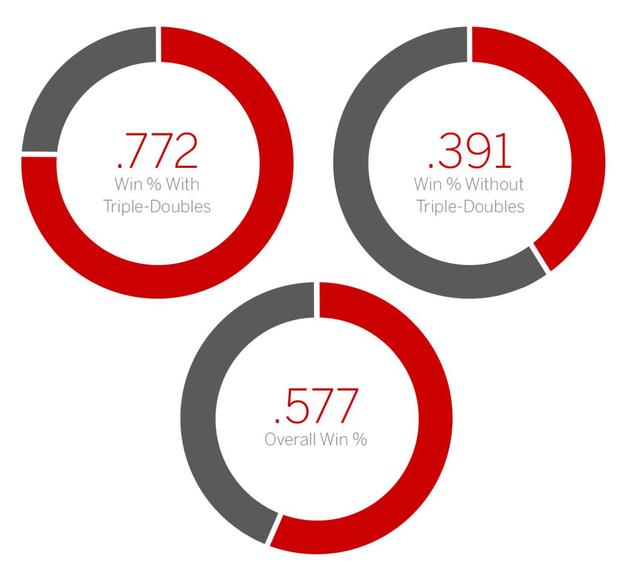 本赛季到目前为止,当韦斯布鲁克打出三双表现的时候,雷霆往往能够赢球,目前的胜率达到77.2%(17胜5负)。而当韦斯布鲁克没有拿到三双的时候,雷霆的胜率只有39.1%(9胜14负)。目前雷霆的战绩为26胜19负,胜率为57.7%。