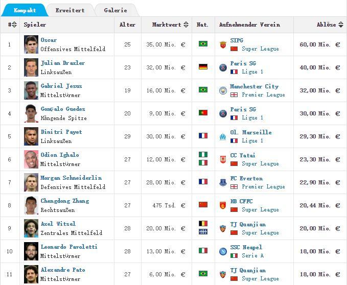 2017冬窗十大转会:奥斯卡成标王 中超占半壁江山