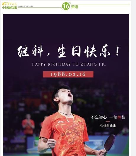 买报纸广告的浪漫还在继续,青岛《地铁晨报》今天的头版整版、内页两版都刊登张继科生日广告“继科,生日快乐,不忘初心,一如既往”。此外,广州、重庆、南京、沈阳、西安、大连、杭州、郑州、昆明、苏州的地铁报中也刊登了张继科生日报导。