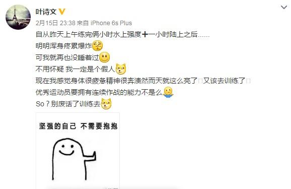 叶诗文在微博上无奈地调侃道:“自从昨天上午练完俩小时水上强度?一小时陆上之后......明明浑身疼累爆炸,可我就再也没睡着过。不用怀疑,我一定是个假人!现在我感觉身体很疲惫精神很奔溃然而天就这么亮了,又该去训练了。优秀运动员要拥有连续作战的能力不是么?So?别废话了训练去!”