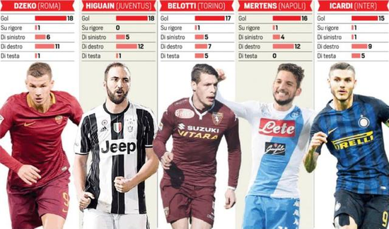 2016-17赛季的意甲,依旧是尤文独自一档,罗马、那不勒斯、国米、拉齐奥群雄追赶。不过意甲射手王的争夺格外激烈,伊瓜因、哲科、贝洛蒂、默滕斯、伊卡尔迪霸占射手榜TOP5,差距只有3球!