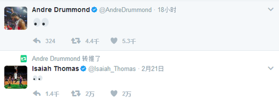 不过,也就在这条交易流言被爆出的前后,绿军当家球星小托马斯在推特上发出了一个谜之表情,这是一双呆呆的双眼的表情符号,并没有配发任何的文字。而不久之后,德拉蒙德竟然也在推特上发出了这一表情符号,两人一前一后竟是形成了“眉目传情”之势。小托马斯一直热衷于为绿军招揽人才,在去年招募霍福德与杜兰特时,他都曾代表球队进行游说。