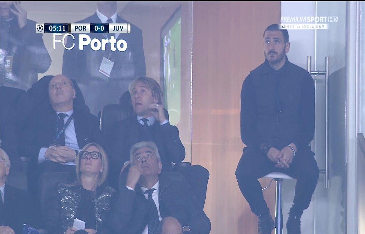 尤文在欧冠1/8决赛第一回合较量中客场2-0战胜波尔图,基本锁定了一张8强的入场券。本场比赛,因为上周末联赛和主帅阿莱格里的争吵,博努奇被队内禁赛一场以示惩罚,在波尔图的巨龙球场,博努奇呆坐在看台上观战的画面让人忍俊不禁。旁边观众席上坐着马罗塔、内德维德等高层,而博努奇像是“黑社会老大的马仔”一样,搬个小板凳坐在旁边。