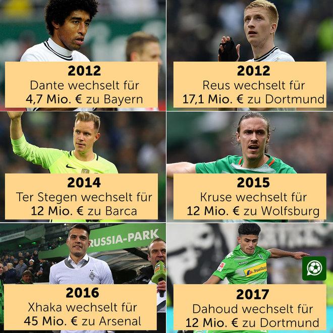 2014年门兴主力门将特尔施特根以1200万欧元加盟西甲豪门巴萨,目前他已经成为巴萨主力门将和德国国脚。2015年门兴把德国国脚前锋克鲁斯以1200万欧元卖给了沃尔夫斯堡,2015年门兴中场核心扎卡以4500万欧元的高额转会费加盟阿森纳。