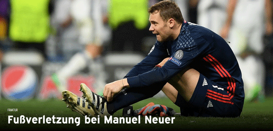 据拜仁官网透露,诺伊尔在比赛加时阶段受伤,当时赛场上的比分为2-2。当时的诺伊尔左脚明显有不适,但是这位德国门神还是坚持了下来。然而就在诺伊尔受伤后不久,C罗就完成了自己本场比赛的帽子戏法,将总比分改写成了3-2。最终拜仁在客场还是没能挡住皇马行如潮水般的攻势,以2-4的比分输掉了这场比赛。