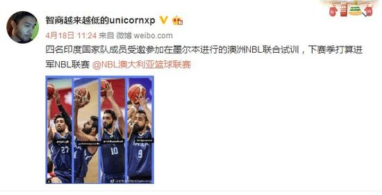 欧洲篮球及NBA选秀专家王健在个人微博上写道:“四名印度国家队成员受邀参加在墨尔本进行的澳洲NBL联合试训,下赛季打算进军NBL联赛。”此后,王健再度更博,他透露身高2.13米的印度国家队队长辛格在试训中表现优异。
