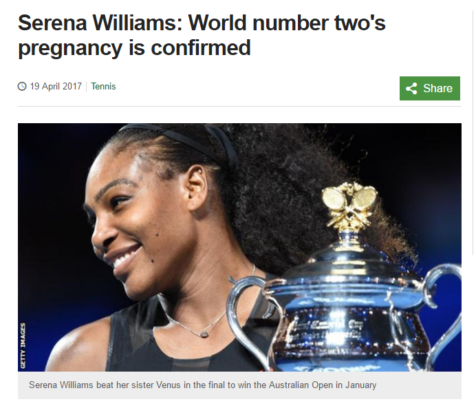北京时间4月19日晚间,35岁的小威廉姆斯在个人社交平台宣布自己已经怀孕20周,这一爆炸性消息立即疯传网络,但过了一个小时之后,小威自己删掉了帖子。据《BBC》透露,小威的经纪人确认,在下周就将重返女单世界第一宝座的小威,目前已经怀孕,其预产期在今年秋天。