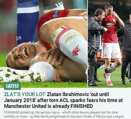 比赛结束后,曼联左后卫卢克肖曾表示,伊布的伤势并没有外界形容的那么严重,直言瑞典神塔在更衣室里随意走动,伤势没什么大碍。但舰队街最新消息称,伊布伤势不仅有大碍,而且十分严重,他的前交叉韧带撕裂,这是膝盖中四条韧带之一,连接大腿骨和胫骨。英国媒体《太阳报》指出,伊布将面临着痛苦的手术,以及漫长的恢复期,按照以往的例子,2017年之前,复出的可能性不存在。该报还专门提到了切尔西中后卫祖玛和阿森纳飞翼沃尔科特,他们都遭遇过类似的伤病打击。
