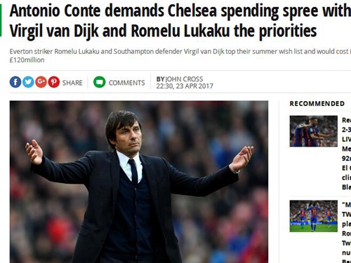 北京时间4月24日,来自英国《每日镜报》的消息,切尔西要在今年夏天进行一番豪购,孔蒂计划花费1.2亿英镑来引进埃弗顿的卢卡库和南安普顿的范迪克,在接受采访时,孔蒂也表态称会向老板伸手要钱。