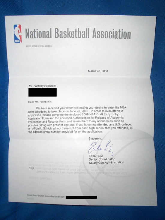 2007年,一位名叫扎克-范因斯坦的球迷就这么做了,起因是他室友说:不如我们去参加NBA选秀吧。这话室友同学说过就算了,毕竟是个玩笑,他本人倒是当了真。然后范因斯坦查询了NBA选秀的相关规则,发现自己符合年满19周岁和离开高中至少一年的规定(这项规定在2006年正式出台),接下来要做的就是给NBA官方写信(当时NBA总裁还是斯特恩),一开始范因斯坦并没有找到NBA联盟办公室的地址,在官方网站上查询了一番也没有收获,于是他决定通过球迷寄信的方式发送邮件,上书:这是我的选秀声明。以引起联盟官员的重视。