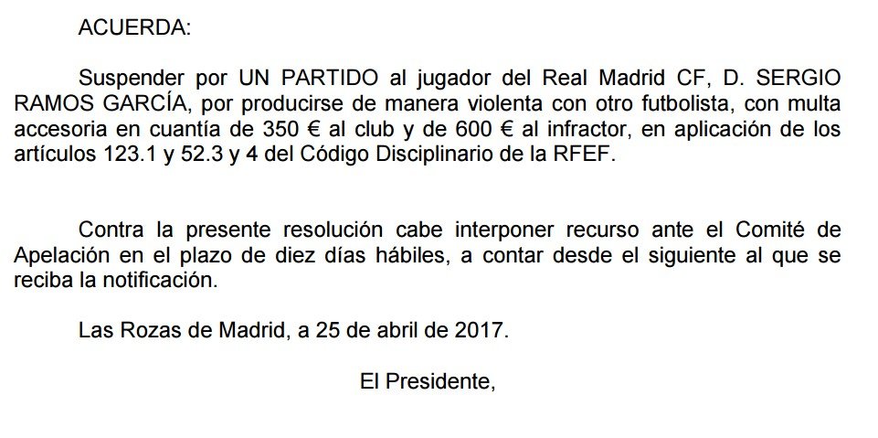 本来在场上被直接红牌禁赛一场无可厚非,但是当时拉莫斯被拍到向裁判鼓倒掌,这个动作应该被追加禁赛。这不得不让人联想到内马尔对阵马拉加吃到的红牌,当时巴萨核心还因为向第四官员鼓倒掌被追加禁赛两场。同样的动作,拉莫斯却没有被追加禁赛,西甲竞赛委员会区别对待皇马巴萨?