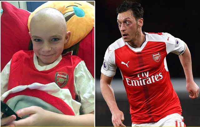 据英媒披露,这名幸运小球迷名叫查理,11岁的他2年前就患上脑瘤,而且在最近又再复发,将需要动手术。为了鼓励他振作,一个慈善机构联系了查理的偶像厄齐尔,后者决定邀请查理作为他的特别客人,在下周二前往酋长球场他的私人包厢现场观看阿森纳与桑德兰的英超补赛。