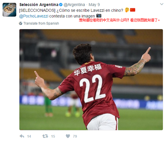 拉维奇在华夏客战国安的比赛中上演助攻大四喜,阿根廷人在中超的抢眼表现也引起了阿根廷国内的强烈关注。阿根廷官方推特狠狠地“秀”了一把拉维奇:知道拉维奇的中文名字怎么写吗?这张照片告诉你。不过令人尴尬的是,拉维奇背后印的中文文字并非他的中文名字,而是他所效力的“华夏幸福”。