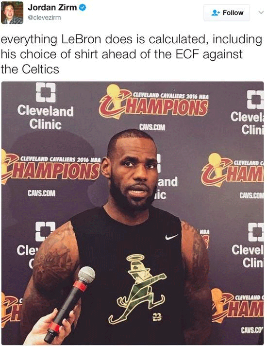 关键是,勒布朗穿的这个小精灵头上还有一个圆圈,有点像是民俗故事中人死后头上所有的光圈,因此也有人怀疑,这是勒布朗在暗指绿军被淘汰的命运。克利夫兰的记者也表示:“勒布朗做什么都是经过精心计算的,东部决赛前他选这样的T恤,绝对是故意的。”