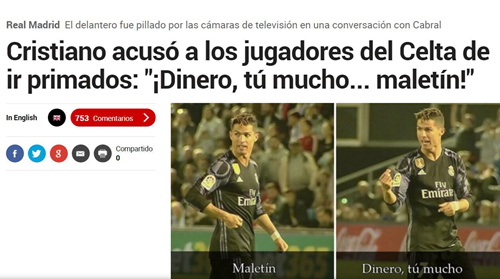 在塞尔塔,皇马赢得了一场关键战役,凭借C罗的梅开二度客场4比1取胜,在积分榜上领先巴萨三分,末轮对马拉加只要拿到一个平局便可夺冠。而在比赛中,除了两粒进球外,C罗还与对方球员发生了争执,并做手势暗示对方之所以这么拼,是因为巴萨向他们开出了赢球奖金,引起了不小争议。
