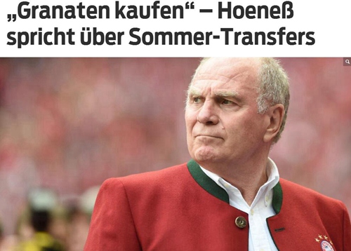 赫内斯在接受采访的时一再强调拜仁目前的实力已经是欧洲顶级,他表示,“我们现在的阵容,如果你想要进一步补强,那你就必须要买手榴弹了。”赫内斯的言论颇有几分当年温格关于引援的“最已阵”说法。客观的说,拜仁的主力阵容确实在欧洲乃至世界足坛已属顶尖,但板凳深度有待进一步增强。而在拉姆、阿隆索同时离去后,右后卫和后腰位置谁来接班,也是一个问题。