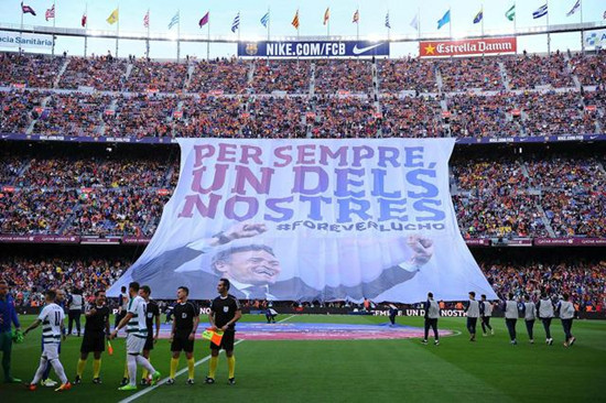 恩里克早早宣布将在赛季结束后离开巴萨,而对埃瓦尔一战既是西甲收官战,也是恩里克在主场的最后一场比赛。巴萨球迷在诺坎普打出了巨大横幅致敬恩里克,上面赫然写着,“恩里克永远是我们的一员”。值得一提的是,这个横幅的尺寸与致敬梅西500球时的横幅尺寸完全相同,由此可见诺坎普球迷对于恩里克的评价。