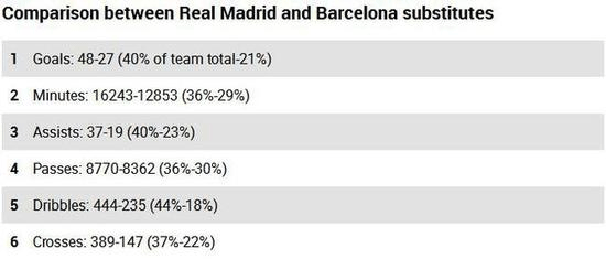 《马卡报》统计西甲36轮前的数据,皇马巴萨替补球员的出场时间差距非常大,皇马替补球员出场时间共16243分钟,比巴萨替补要多12853分钟。而皇马替补共打进了48球,占到了全队进球数的40%,巴萨替补只有27球,仅占全队进球数的21%。其他关键数据的对比上,巴萨替补也同样落下风。即便是替补阵容的身价对比,德国权威网站《转会市场》给出的皇马替补身价达到了2.195亿欧元,巴萨替补身价则只有1.635亿欧元,比皇马少了5600万欧元。 ?
