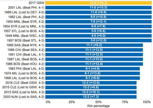 勇士12连胜季后赛新高 场均净胜16.3分攻击最强