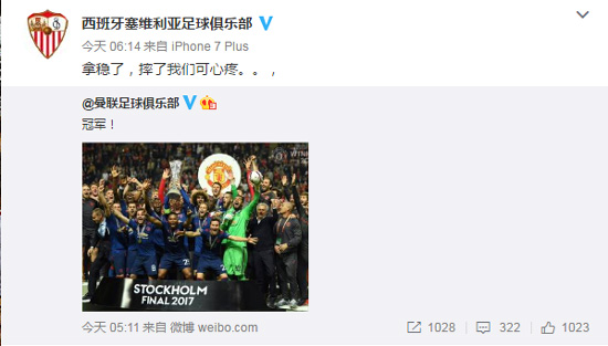 在曼联夺冠之后,塞维利亚的官方微博在曼联的夺冠微博下面留言:“拿稳了,摔了我们可心疼……”