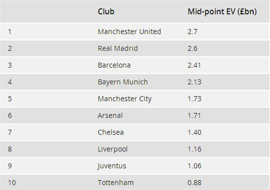 这项统计不包括2016-17赛季的商业运作和运动成绩。其中,曼联提高了7%,也这让他们超过皇马,后者的估值是26亿英镑。巴萨排名第三,估值24.1亿英镑,紧随其后的是拜仁,估值为21.3亿镑,第五是曼城,估值为17.3亿镑。