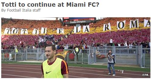 据意大利媒体的消息,罗马名宿托蒂有可能加盟北美足球联盟球队迈阿密联队。这支美国第二级别联赛球队的所有者正是他的意大利国家队前队友马尔蒂尼。