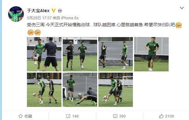 在5月8日国安主场对阵华夏幸福的比赛,最终那场比赛国安被华夏4:1击败,而于大宝在第17分钟受伤离场成为球队大比分失利的转折点,于大宝离队后国安丢了魂,这名在12强赛进球击败韩国队的抗韩英雄需要2~3周养伤时间,5月29日于大宝晒出恢复训练照片,要出战叙利亚的比赛,看来是没有希望了!