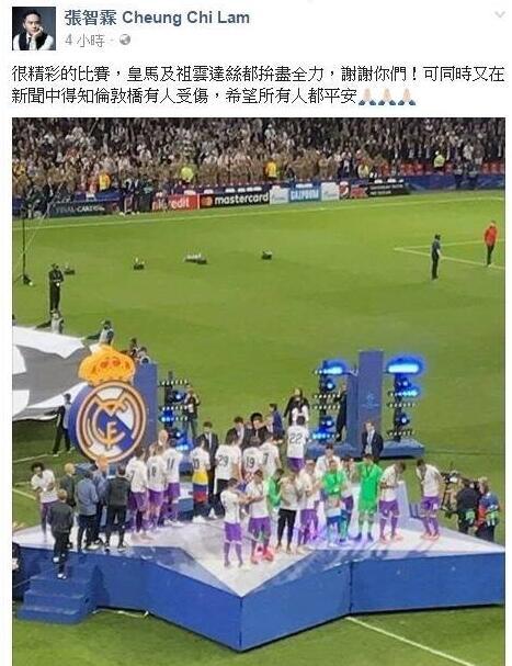 张智霖一家三口在英国观战皇马VS尤文的欧冠决赛,当伦敦发生恐袭事件,粉丝都担心他们的安全。张智霖6月4日早上留言报平安,令亲友及粉丝都松了一口气。他留言道:“很精彩的比赛,皇马及祖云(尤文)都拼尽全力,谢谢你们!可同时又在新闻中得知伦敦桥有人受伤,希望所有人都平安。”