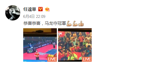 近日,2017杜塞尔多夫世乒赛正在如火如荼的进行,赛会头号种子马龙以4-2战胜36岁的东道主球星波尔,闯入男单的四强。赛后,同样关注着世乒赛的香港影星任达华误以为马龙已经夺取了世乒赛的冠军,在微博上写到:“恭喜恭喜,马龙夺冠军”,事后任达华表示是因为太激动了,所以写错了。