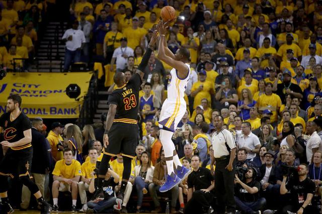 在第二战中,杜兰特拿到33分13个篮板6次助攻5次封盖3次抢断,他也成为了首位在季后赛中同时拿到这组数据的球员。同时,杜兰特还有效肩负起了防守詹姆斯的重任,而在进攻端,当勒布朗防守阿杜时,后者在两场比赛里17投10中拿到了23分。