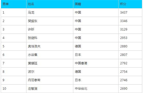 男单马龙实现世乒赛卫冕后,继续排名第一,樊振东和许昕分列第二和第三,张继科排在第四。德国名将奥恰洛夫第五,日本名将水谷隼第六,中国香港好手黄镇廷第七,另外一位德国名将波尔第八。打进世乒赛八强的丹羽孝希升至第九,中华台北的庄智渊位居第十。