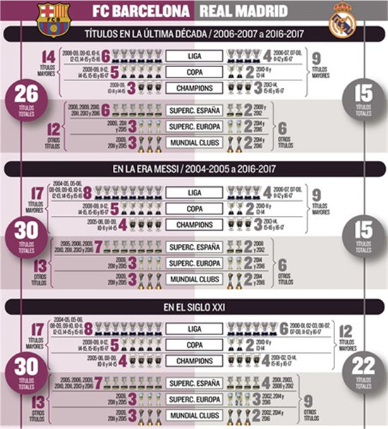除了过往10年的战绩之外,《世界体育报》还比较了自从梅西在2004-05赛季出道之后以及21世纪以来皇马与巴萨之间所取得的荣誉,其结果也是巴萨占据绝对的优势。自从梅西出道之后,巴萨一共获得了30座冠军奖杯(8次西甲冠军、5次国王杯冠军、4次欧冠冠军、7次西超杯冠军、3次欧洲超级杯冠军、3次世俱杯冠军),这个数字刚好是皇马(15座冠军奖杯)的2倍。
