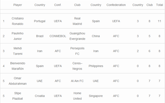 世界顶级射手榜:恒大外援全球第2 仅落后C罗