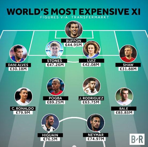 2016-2017赛季已经结束,著名体育媒体《露天体育看台》也根据德国的《转会市场》给出的球员转会身价盘点了当今世界足坛转会身价最高的11人阵容。皇马球员三人上榜,而尤文图斯球员则有两人入围。